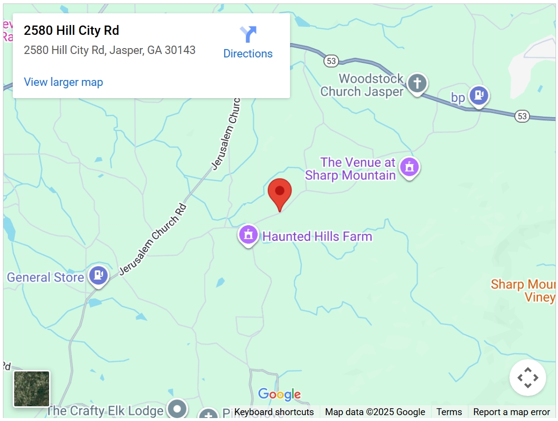 We are located 2.6 miles off of Hwy 53 W at 2580 HIll City Rd Jasper, GA 30143